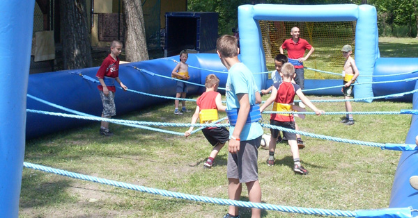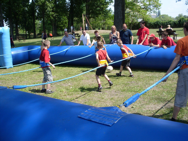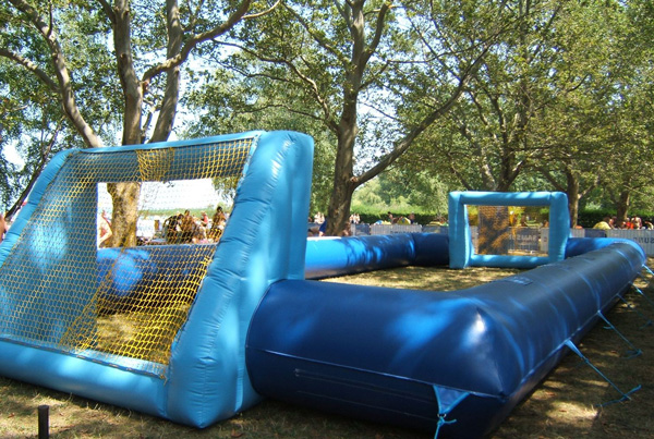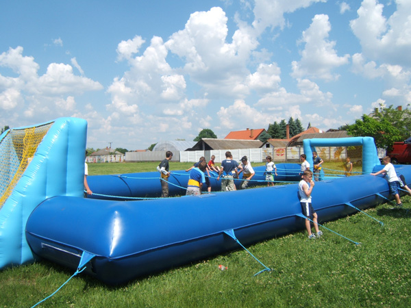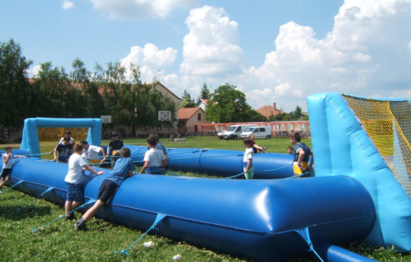 A 7x14 méteres pályaméretű óriás élőcsocsót 10 fő használhatja egyszerre, tehát 5 fős csapatok mérhetik össze tudásukat. Használható kötelekkel, hevederekbe bekötve a valódi csocsót imitálva, de használható mindezek nélkül is, egyszerű felfújható focipályaként.
